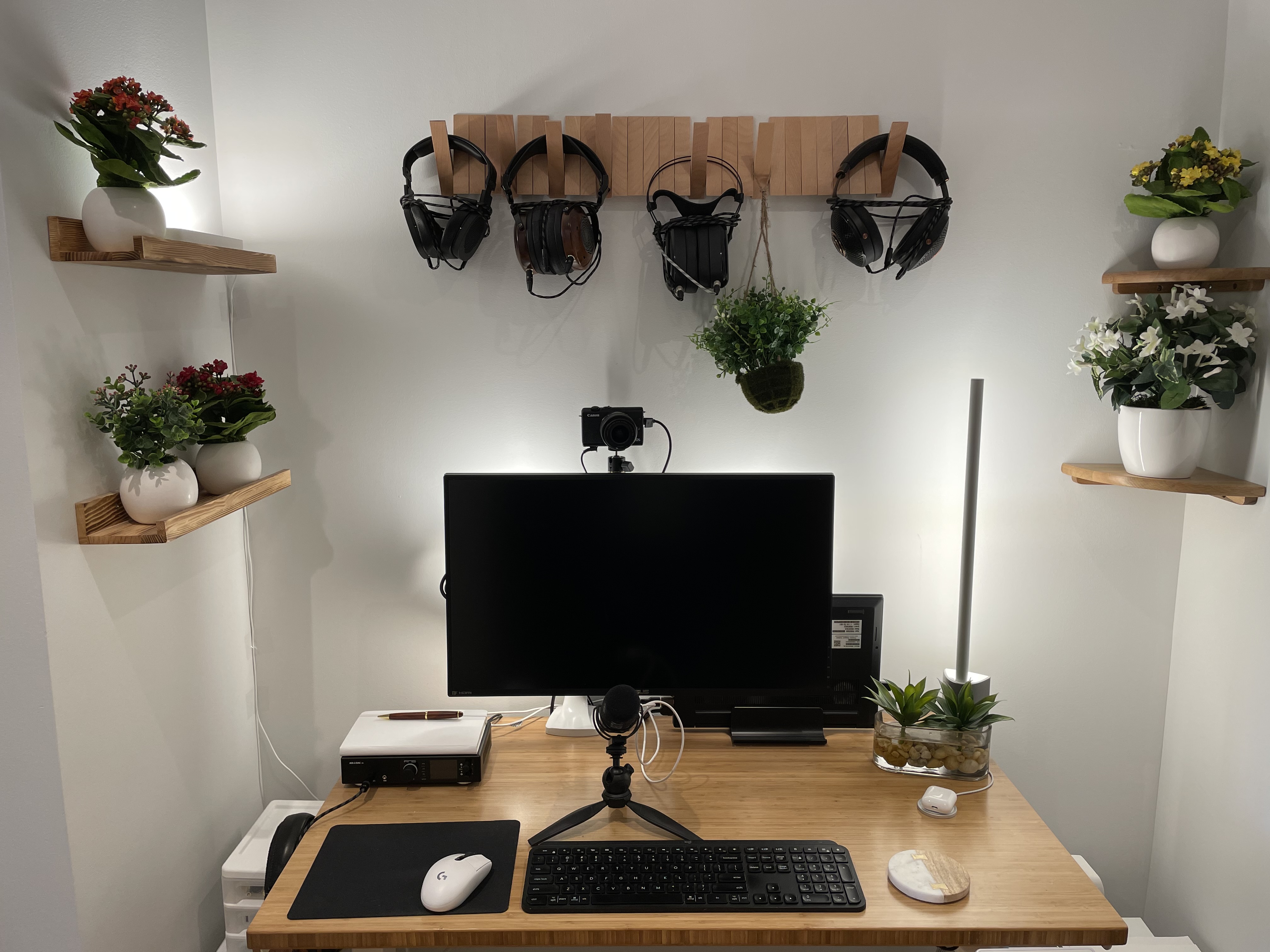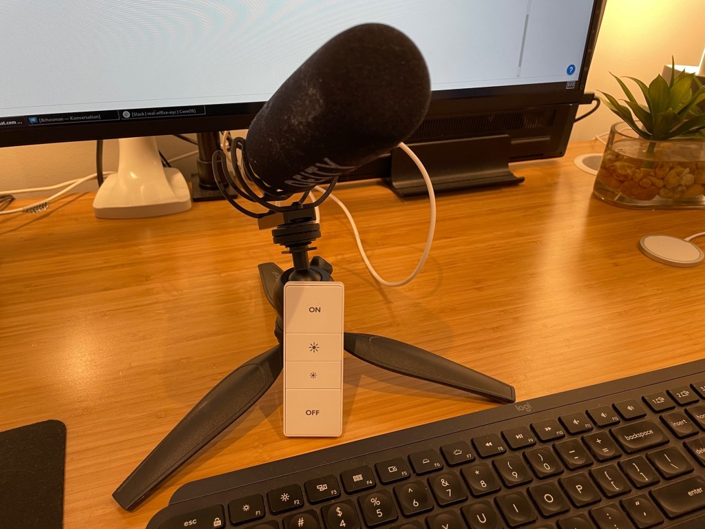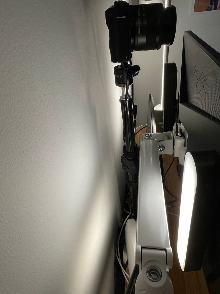 The initial challenge was moving my workstation from a sizable room with plenty of natural light to a nook that’s a good 20 meters from a window. My USB webcam (a Logitech StreamCam) just couldn’t deal with the darkness – the video was grainy and choppy. The nook has 2 spotlights directly overhead that do a fantastic job of highlighting my receding hairline.