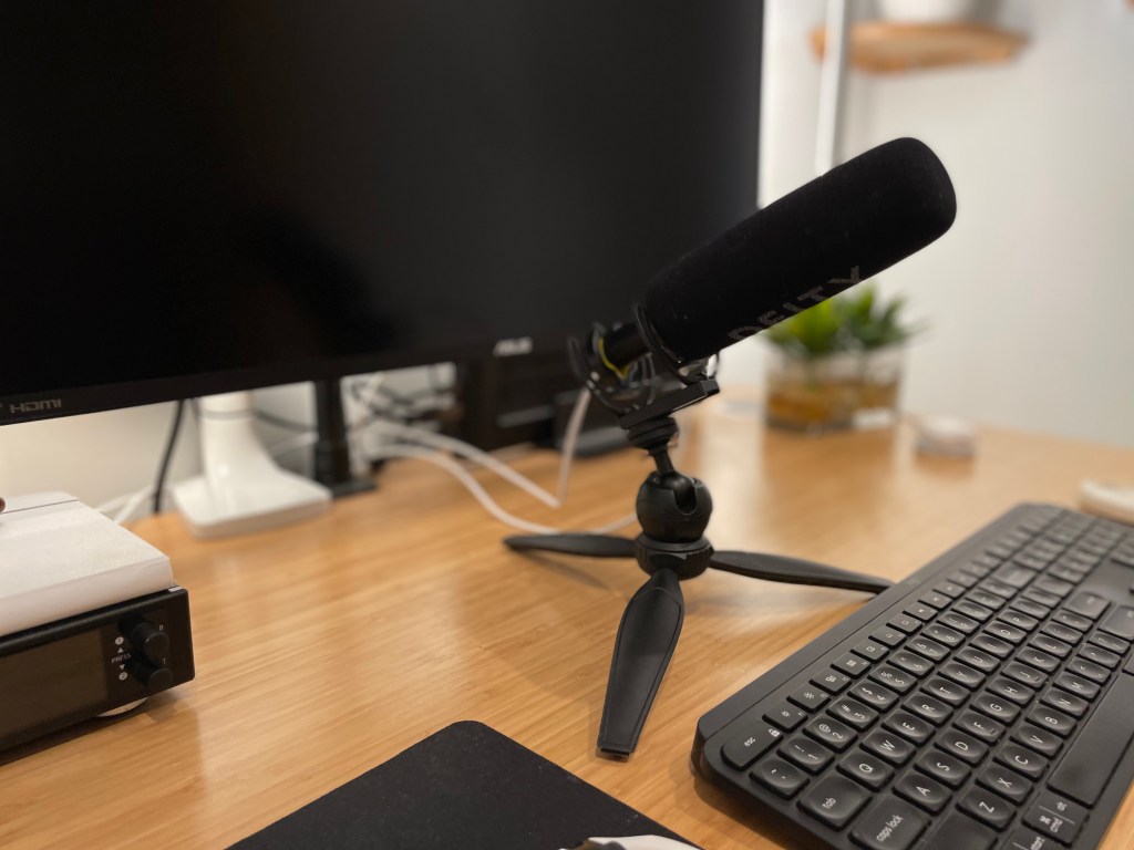 Shotgun mics, otherwise known as video mics, are typically mounted to the top of a video camera and are used in outdoors situation where the audio source is a few meters away from the mic. As you can understand they’re intended for longer range audio pickup – perfect! I put a Deity V-Mic D3 Pro on a desktop stand, hooked it up to my laptop’s aux output, a USB C cable to a power outlet, and viola! Marginally better audio for five times the cost!
